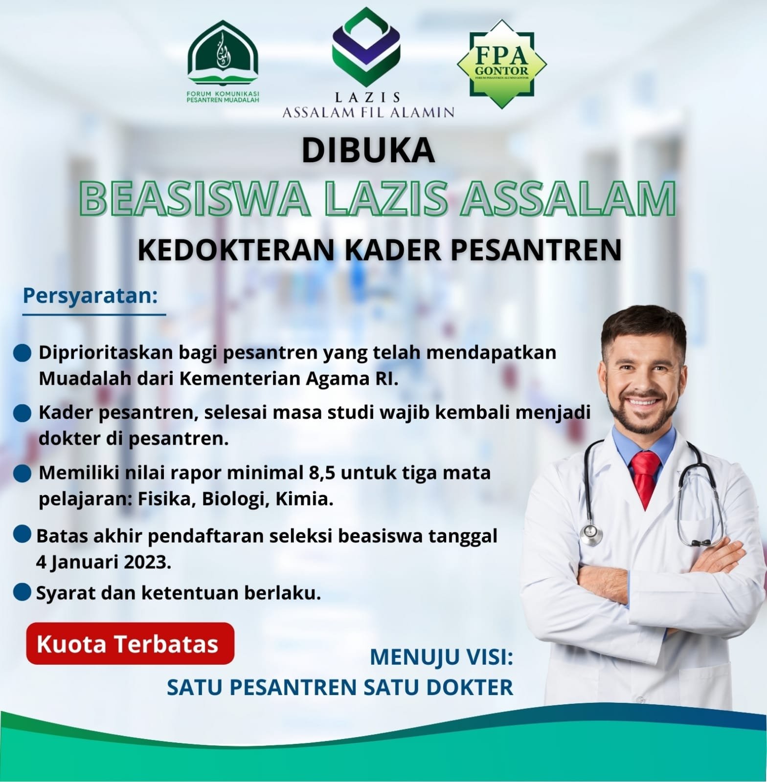 Mimpi menjadi seorang dokter adalah impian mulia yang seringkali terbentur pada biaya pendidikan yang tidak sedikit. Pendidikan kedokteran dikenal sebagai salah satu jurusan dengan biaya tertinggi, meliputi biaya kuliah, buku, peralatan, dan biaya hidup selama masa studi yang panjang. Namun, jangan biarkan kendala finansial menghalangi cita-cita Anda. Kabar baiknya, ada berbagai peluang beasiswa kedokteran yang tersedia bagi para calon dokter yang berprestasi dan memiliki motivasi tinggi untuk berkontribusi bagi kesehatan masyarakat.
